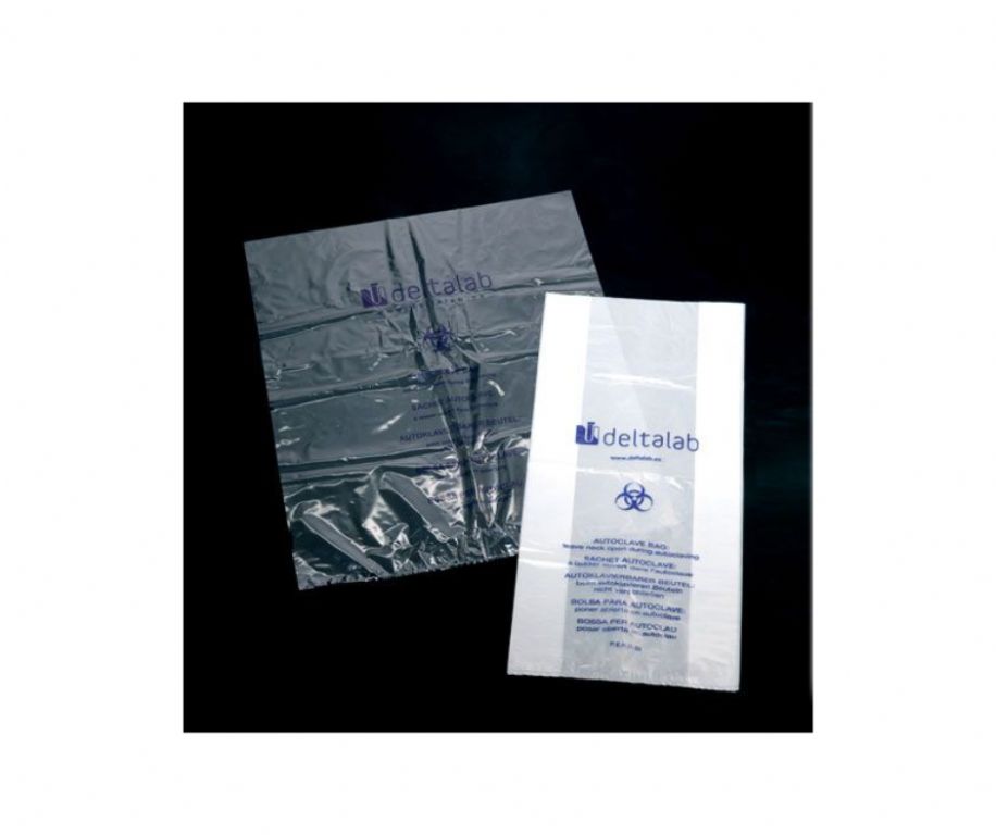 The biohazard graphic emblem and usage instructions are printed on the autoclave bags made by Deltalab in five different languages. While putting the bags in the autoclave at 121°C, do not seal them hermetically.