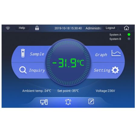 The dual refrigeration systems run independently and alternately, both reaching -80ºC, such that if one system fails the other will maintain temperature to ensure sample storage safety.