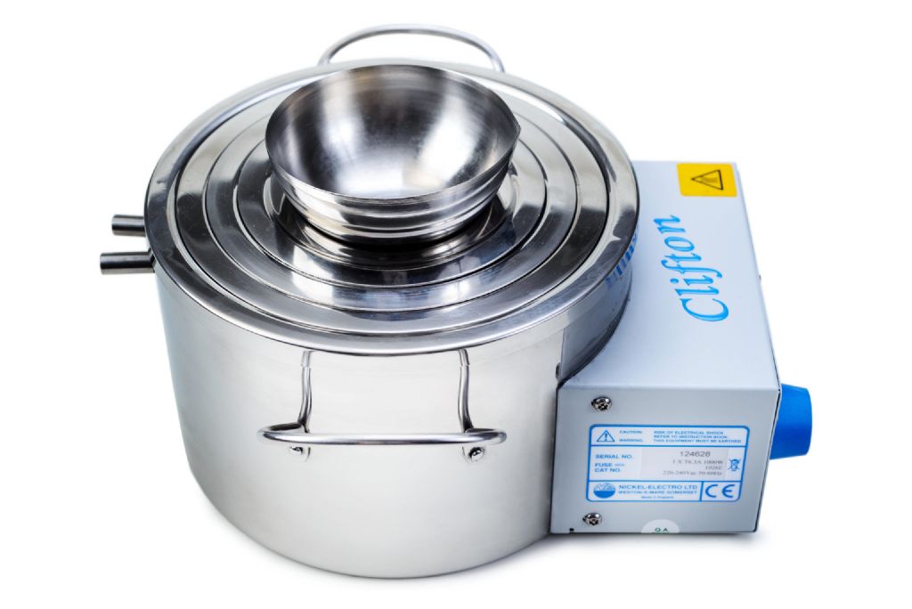 Stainless steel round boiling baths. 1026ER regulates from a gentle simmer to a vigorous boil, whereas the 1026E continuously boils. Both fitted with a sheathed immersion heater and constant water level device, with resettable thermal cut out for low water level condition. Supplied with a set of rings to vary the aperture diameter accommodating different sizes of vessels such as evaporating dishes, glassware and round bottom flasks heated by steam.